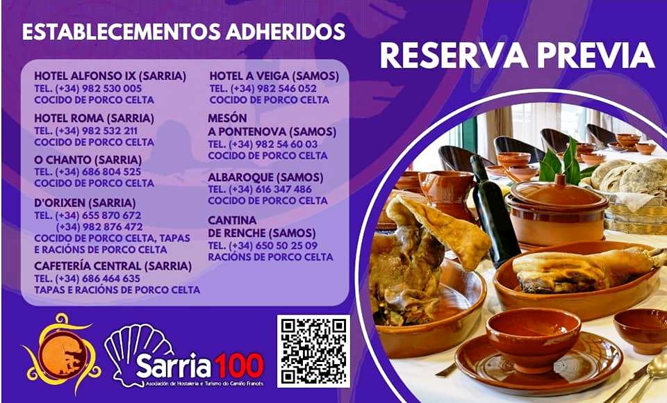 Por segundo año consecutivo, la celebración no podrá desarrollarse en su formato tradicional multitudinario. No obstante, el espíritu de la Festa se mantiene a través de la implicación del tejido hostelero local y comarcal. Durante el fin de semana, el cocido podrá degustarse en el Hotel Alfonso IX, el Hotel Roma, O Chanto, D’orixen y la Cafetería Central, en Sarria. Asimismo, establecimientos de Samos como el Hotel A Veiga, el Mesón A Pontenova y la Cantina de Renche se suman a la iniciativa.